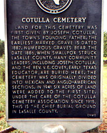 Historical Marker: Land for this cemetery was first given by Joseph Cotulla. The Town's founding father. The Earliest Marked grave is dated 1882. Numerous graves bear the date 1886, when smallpox struck LaSalle County. Many community leaders, including Joseph Cotulla, and the Rev. V. E. Covey, Early Texas Educator, are buried here. The cemetery was originally divided into Mexican and Anglo-American Sections. In 1941 six acres of land were added to the first site. Under the care of the Cotulla Cemetery Association since 1915, this is the chief burial ground in LaSalle County. 1981. |