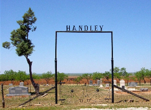 Historical Marker: Site given by John J. Handley (1842-1935), Confederate veteran who settled here in 1892, after living earlier in Georgia and in Smith and Comanche Counties, Texas. A farmer, he lived to see agriculture rival ranching. Teville (named for "T" Junction in road) post office was opened here in 1906; closed 1910. W.B. Berry, with W.H. Badgett, surveyed 4-acre cemetery, 1914. Graves were moved from across road into this ground. In 1945 Mr. and Mrs. E.T. Strain gave one acre to enlarge the cemetery. Four generations of Handley's family and neighbors rest here. (1970)