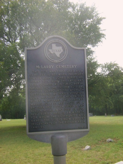 This site was first used as a cemetery in 1851 when property owner John R. Jones buried his infant son here. The land was later donated as a public burial ground for the pioneer settlers of the surrounding Wilmeth settlement by Mary Virginia Dunn McLarry and her father Robert A. McLarry. The earliest marked graves are those of a brother and sister, Henry E. & Adella M. Hall, who died in 1870. Also buried here is J.B. Wilmeth, for whom the community was named. The site is now used by descendants of the pioneer area families.