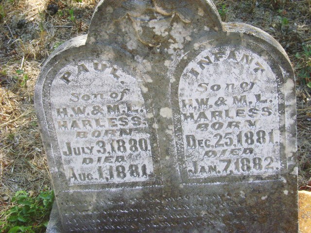 Here W. P. Harris buried his wife, Margaret J. (Harless) and their infant daughter Mary Lou in 1873. Their graves are the first marked, others buried in the cemetery include Uriah C. Harless, Confederate veteran and son of H.C. Harless; physician and minister J.L. Brockman, and several other community leaders. The graves of numerous Masons and Woodmen of the World are indicated by fraternal symbols on headstones.