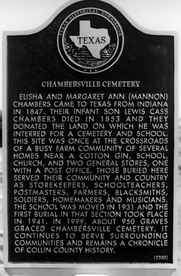 The Chambersville Cemetery has been in use in Collin County since 1853. It is located about 10 miles NNW of McKinney, Texas at the intersection of County Road #206 and #281. To go to the cemetery from McKinney, take State Hiway 543 at Exit 43 on U.S. Hiway 75. Go north about 1.5 miles to the intersection of County Road 206 and State Hiway 543. Take 206 north about 3 miles to Road 281 and the Chambersville Cemetery.
