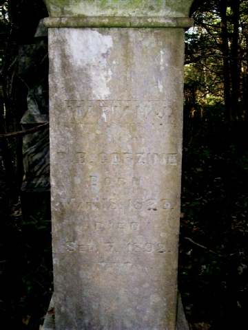 | Butler | Lorinda | - | - | - | - | Butler | Margaret | 25 Aug 1871 | 16 Jul 1892 | - | Gone but not forgotten | Butler | Mary E. | 17 Jul 1866 | 07 Jul 1886 | d/o A.H. & L. Butler | Farewell "Gone but not forgotten"- | Carroll | M.J.E. | 12 Jun 1859 | 10 Dec 1881 | M:01 Dec 1881 | Marker is off its base and lying behind the foundation stone on the ground | Carroll | Nancy Ludewell | 01 Apr 1821 | 01 May 1890 | - | - | Carroll | William | 09 Jan 1816 | 28 May 1872 | - | - | Cheney | _____ Grafton | 22 Oct 1880 | 15 Sep 1882- | - | -Marker is overturned | Cheney | James Henderson | 02 Mar 1879 | 14 Sep 1882 | - | -Marker is overturned and broken- | Cheney | John W. | 08 Sep 1854 | - | s/w Mary Cheney | - | Cheney | Mary | 15 Jan 1854 | 05 Feb 1936 | s/w John W. Cheney-- | - | Cheney | R.E. | 27 Aug 1875 | 28 Nov 1940- | - | - | Cheney | Sallie | 26 Feb 1829 | - | - | - | Cole | Clarissa | 20 Mar 1835 | 07 Apr 1916 | s/w- Hiram Coler | MOTHER-- | Cole | Fannie R. | 11 Oct 1889 | 14 Apr 1919 | Stone overturned | THOUGH LOST TO SIGHT TO MEMORY DEAR- | Cole | H.M. | 21 May 1865 | 06 Jan 1891 | s/o John & E.A. Cole |