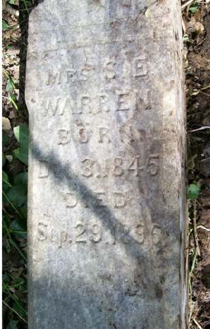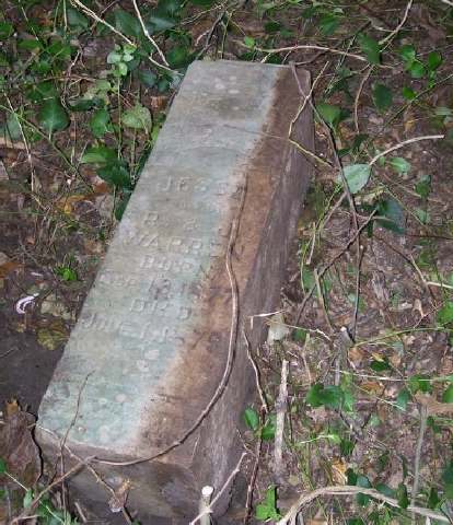 | UNKNOWN | - | - | - | - | This grave is beside the grave of Mary McCown and is completely caved in. You can clearly see the outline of the casket below in the concave surface of the earth, an animal has burrowed beneath the marker and it is facing the opposite direction against the edge of the larger hole that makes up the grave. | Warren | Jane | 21 Jan 1832 | 22 Oct 1907 | s/w Reuben Warren | Our parents have gone to a mansion of rest to the glorious land by the deity blessed | Warren | Jesse | 19 Sep 1877 | 01 Jun 1879 | s/o R. & J. Warren; Marker is overturned and lying on ground | - | Warren | Mrs. S.E. | 03 Dec 1845 | 29 Sep 1896 | Marker is overturned and lying on ground | - | Warren | Reuben | 13 Apr 1821 | 04 Sep 1888 | s/w Jane Warren | Our parents have gone to a mansion of rest to the glorious land by the deity blessed | Warren | Richard | 29 May 1856 | 08 Apr 1886- | - | - | Watts | A.C. | 1830 | 08 Jul 1909 | Marker overturned and lying on ground | - | Watts | Josiah | 08 Feb 1844 | 28 Sep 1890 | s/w Julia Watts | - | Watts | Julia | 17 Jul 1844 | - | s/w Josiah | - | Webb | John Paul | 26 Jan 1900 | 30 May 1910 | s/o J.A. & Mollie R. Webb- | - | Whitaker | Son | 21 Jun 1904 | 02 Jul 1904 | s/o J.G. & Elmira Whitake | BUDED ON EARTH TO BLOOM IN HEAVEN | Whitaker | Hannah E. | 25 Jan 1832 | 11 Sep 1888 | s/w Meridith W. Whitaker | Beloved parents. farewell | Whitaker | Meridith W. | 28 Jul 1844 | 24 Oct 1904 | s/w Hannah E. Whitaker | Beloved parents. farewell | White | George N. | 14 May 1869 | 30 Jul 1883 | s/o W.T. & E.L. White |