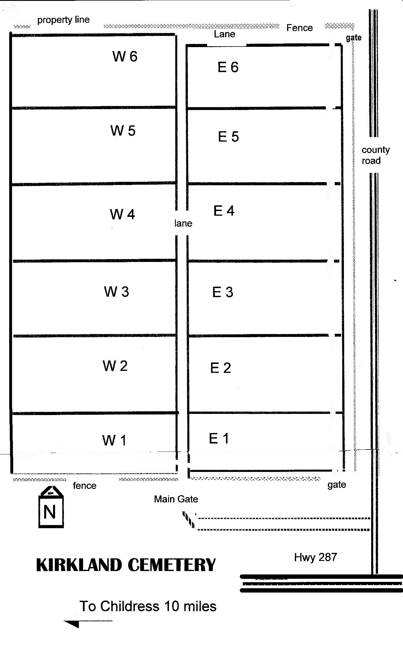 The cemetery (Longitude 100.04091: Latitude 34.37835) is located one half mile east of Kirkland, Texas on the north side of US Highway 287, approximately 300 feet from, and visible from the highway. There is a road along the center of the cemetery and tombstones are situated either on the West of the road or the East of the road as indicated below. Names or data enclosed in parentheses ( ) are not on tombstones, but from personal knowledge.