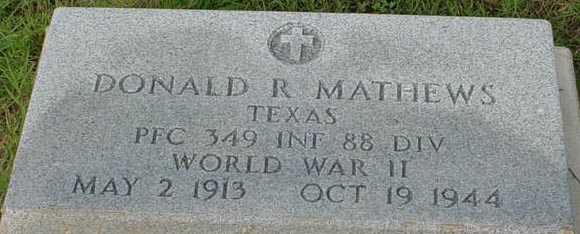 | Mathews | Donald R. | May 02 1913 | Oct 19 1944 | Texas PFC 349 WWII |