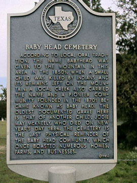 Historical Marker: According to local oral tradition, the name BabyHead was given to the mountain in this area in the 1850's, when a small child was killed by indians and its remains left on the mountain. A local creek also carried the name, and a pioneer community founded in the 1870's became known as Baby Head. The oldest documented grave here is that of another child, Jodie May McKneely, who died on New Year's Day 1884. The cemetery is the last physical reminder of the Baby Head community, which once boasted numerous homes, farms and businesses. (1991)