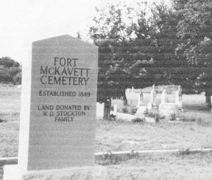 The historic McKavett Cemetery is located in a pastoral setting about one-half mile northwest of the entrance into the Fort. It is in the near vicinity of the San Saba River on Schleicher County Road #245 (old road to Sonora). Not unlike a "druid of eld", a mammoth oak near the southwest corner of the historic spot has stood as a silent and gigantic sentinel throughout the ages.