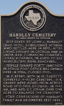 Historical Marker: Site given by John J. Handley (1842-1935), Confederate veteran who settled here in 1892, after living earlier in Georgia and in Smith and Comanche Counties, Texas. A farmer, he lived to see agriculture rival ranching. Teville (named for "T" Junction in road) post office was opened here in 1906; closed 1910. W.B. Berry, with W.H. Badgett, surveyed 4-acre cemetery, 1914. Graves were moved from across road into this ground. In 1945 Mr. and Mrs. E.T. Strain gave one acre to enlarge the cemetery. Four generations of Handley's family and neighbors rest here. (1970)